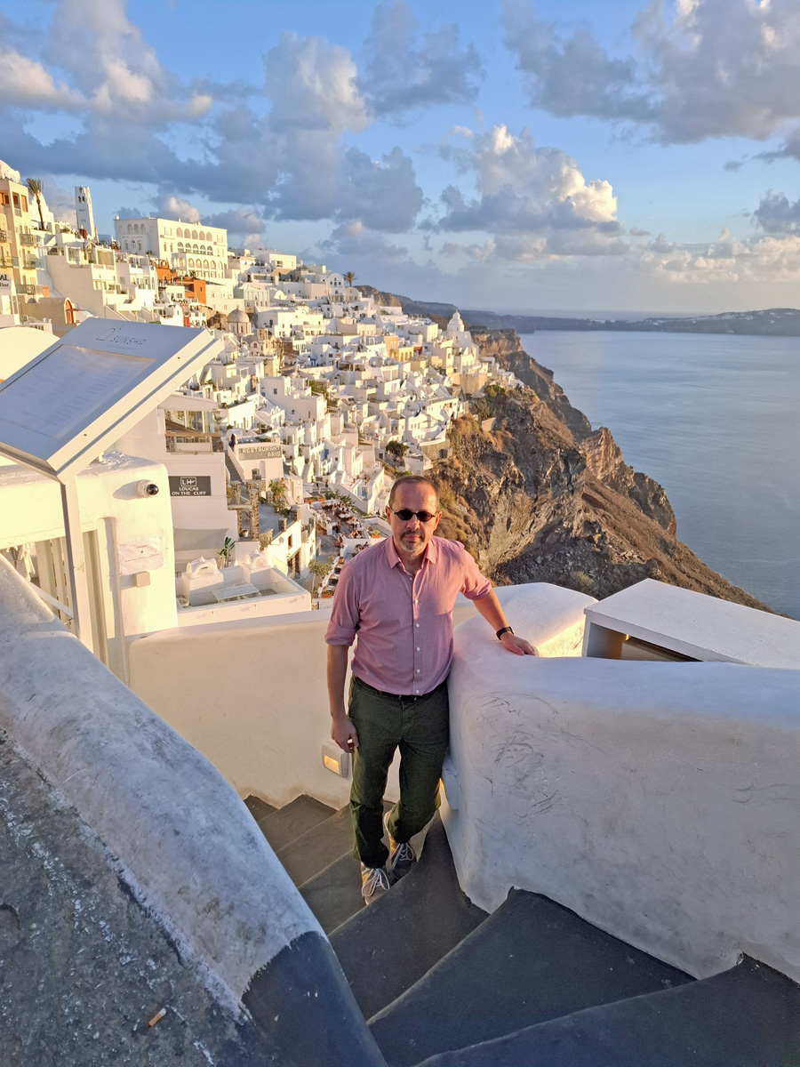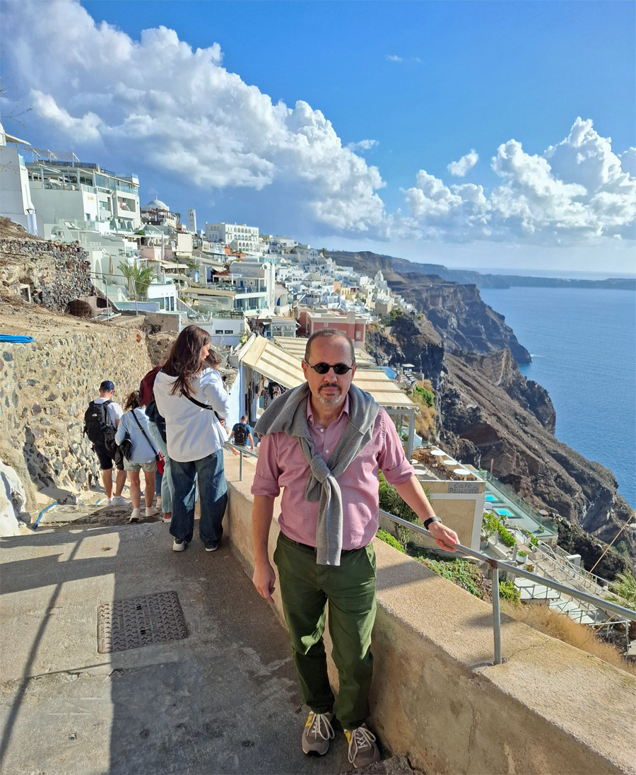 Climbing the stairs in Fira