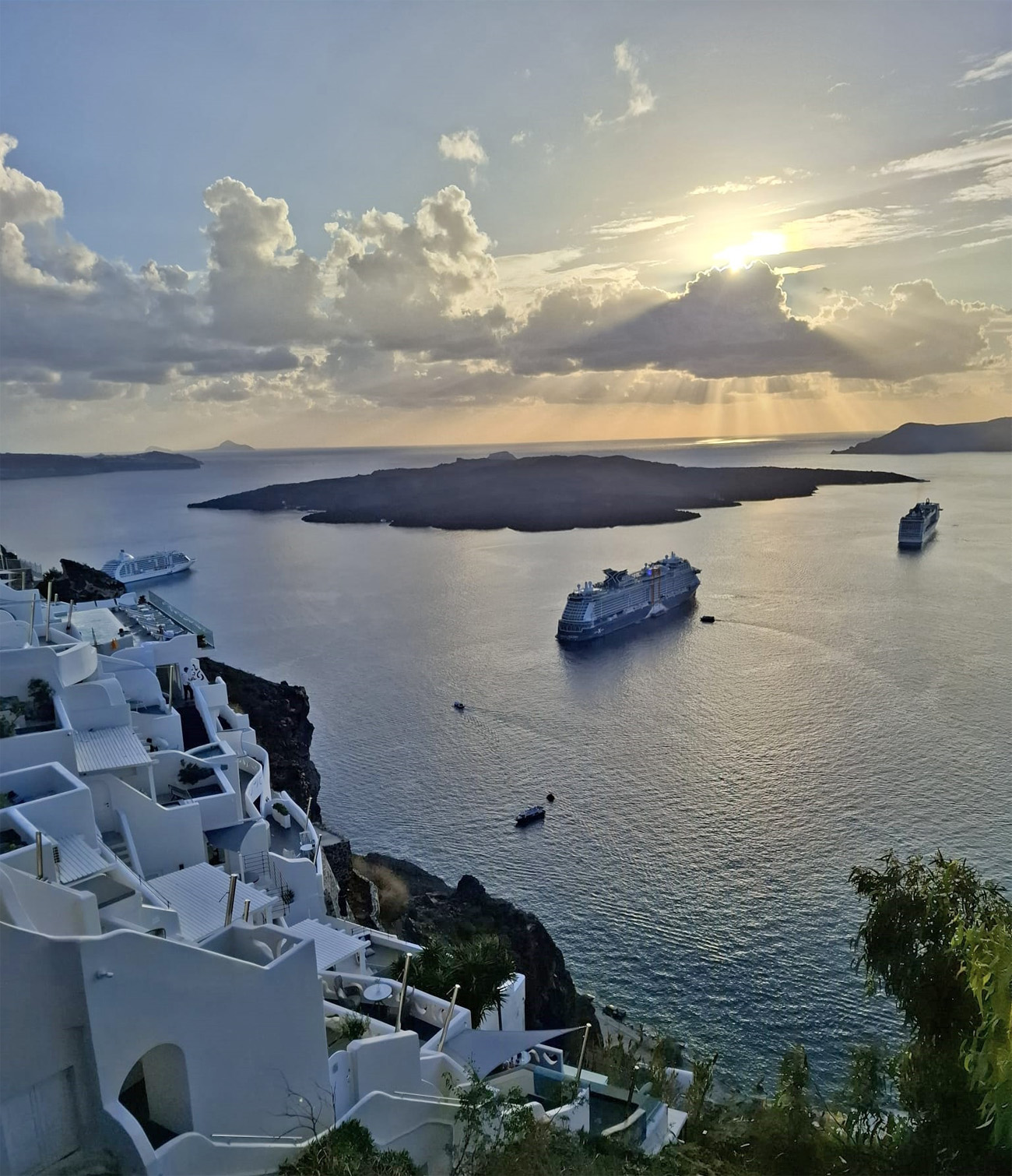 Fira) Ship of Celebrity Cruises anchored at Gialos Bay Fira, main town of Santorini, with caldera wall (Saint Mina's Orthodox Church in the background)