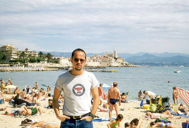 Beach of Antibes. Background: the fortified old town of Antibes; behind: coastline of Nice and mountains of the Provence.